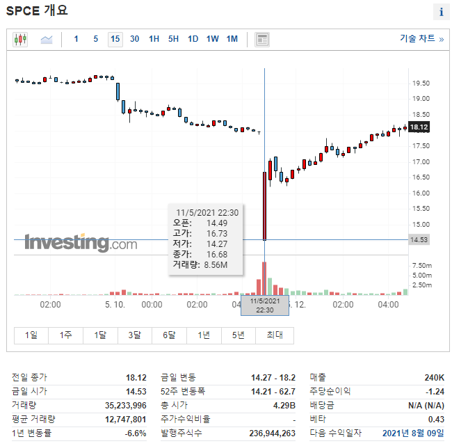 실제 예정된 5월의 Test 비행 일정이 구체화되지 않으며, 개발 중인 기체 이슈, 버진그룹의 주식분할 매도, 아크인 베스트 캐시 우드의 매도로 인해 좋은 소식이 하나도 없었는데요.. 5/10 미국 주식 기술주의 약세가 나온 다음날인 5/11일 프리장 시간인 17:00~22:30의 시간 동안 -20%의 상황이 발생하게 됩니다.. 많은 분들이 당황하셨죠..
