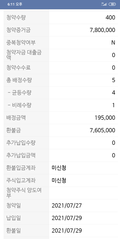 총 400주를 신청 했으나, 최소물량 10주에서 4주를 획득했으며, 나머지 390주에서는 1주만 비례로 받았네요.. 결과 5주 획득입니다.