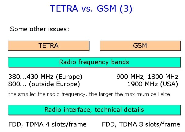 아래는 GSM과 비교한 표이지만, 특성을 아주 잘 요약한 것 같습니다. GMS은 무시하시고 Tetra 특성만 보시면 되겠네요.