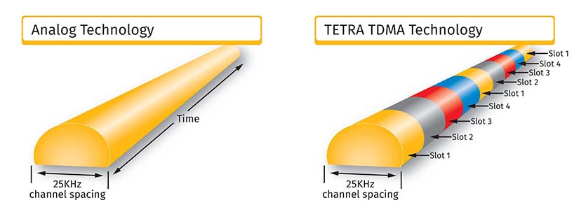 일반적인 UHF/VHF는 채널이라는 개념이 하나만 사용되지만, Tetra는 하나의 채널을 4개의 슬롯 개념으로 분할하는 게 가장 큰 특성의 차이점입니다.