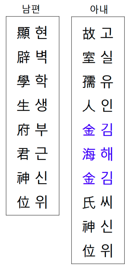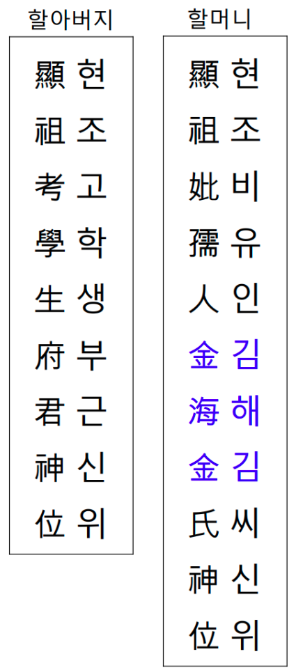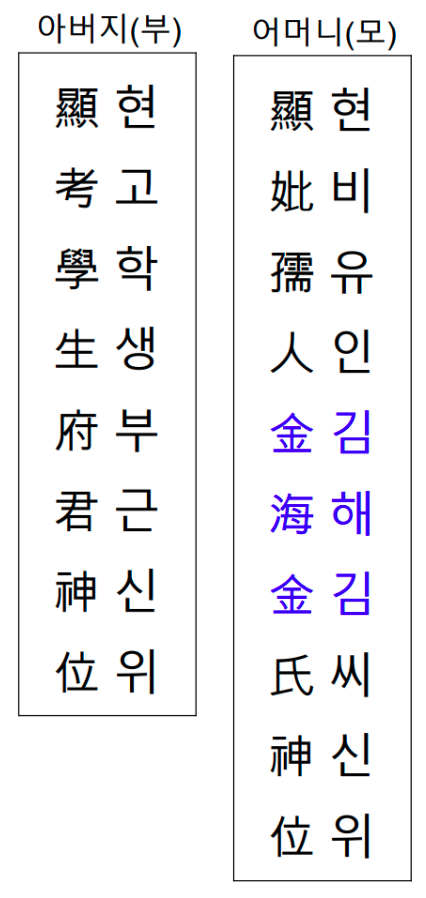 보라색은 고인의 본관과 성씨입니다, 모르시는 분을 위해 가장 하단에 한국에서 가장 많이 사용하는 성씨 30개를 예시로 표기하였으니 필요하신 분은 참고하셔서 작성 바랍니다.