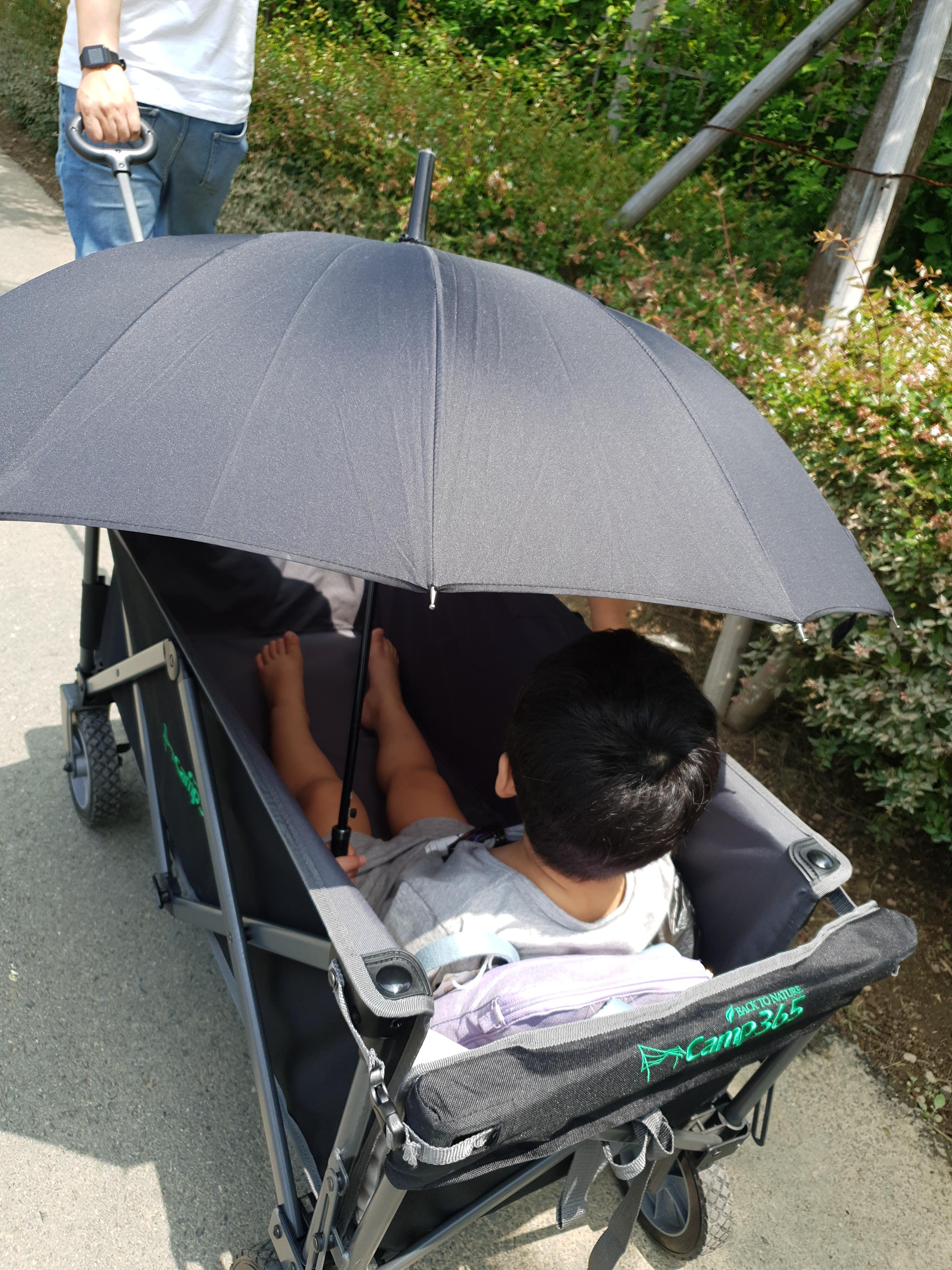 ㅋㅋ 아이가 정말 좋아하네요. 햇빛이 있어도 우산을 쓰면 나들이 가능하죠