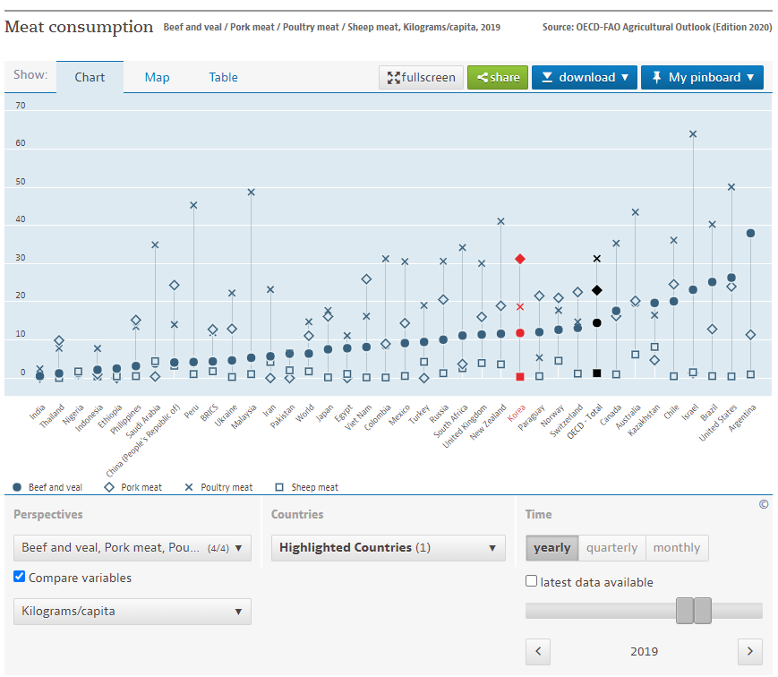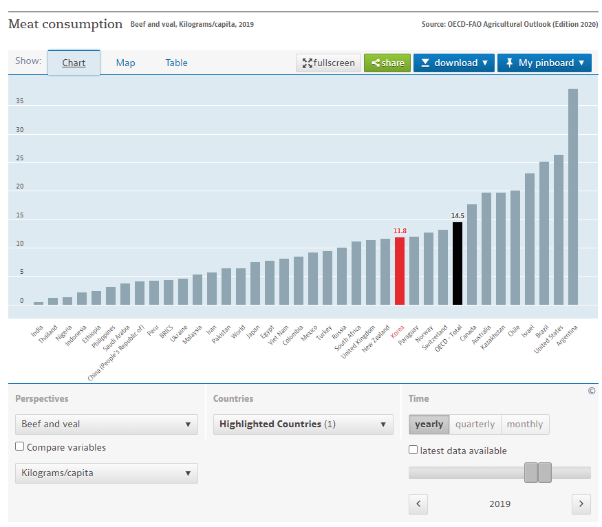 최신 OECD Data이며, 아르헨티나가 전 세계에서 가장 많은 육류를 소비합니다. 한국은 다른 나라에 비해서 고기를 적게 먹는 걸 알 수 있습니다.