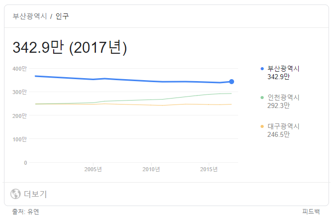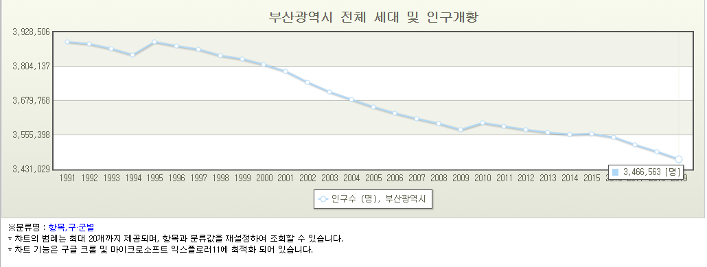 부산광역시 인구는 다른 시도와는 틀리게 지속적으로 감소 추세를 보이고 있습니다.