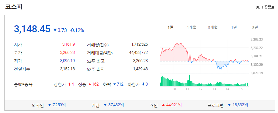 미국이 1월 7일 채권금리를 올리며 외국인과 기관은 코스피 시장에서 빠지는 분위기였지만, 개인이 엄청난 분발을 하며 3,100 포인트를 유지했습니다....