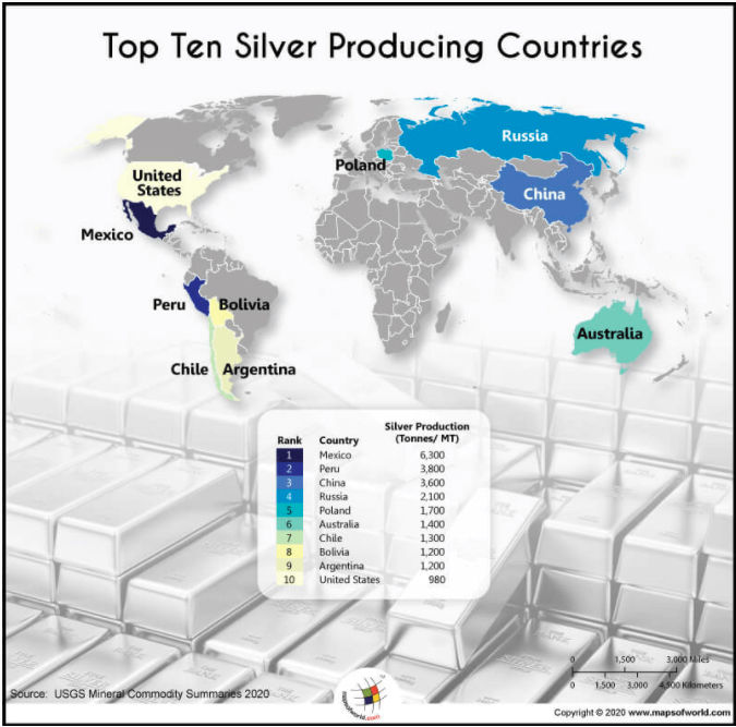 세계에서은을 가장 많이 생산하는 나라는 멕시코입니다. 2019 년에 중국은 6,300 톤의 금속을 생산했으며, 이는 작년에 비해 180 톤 증가한 수치입니다. 멕시코의 은 생산량은 더 증가할 것으로 예상됩니다. 멕시코에 위치한 Fresnillo(1887년 시작)는 세계에서 가장 큰 광물회사로 7개의 광산을 운영하고 있습니다.