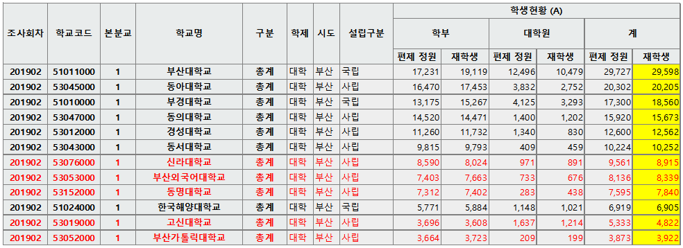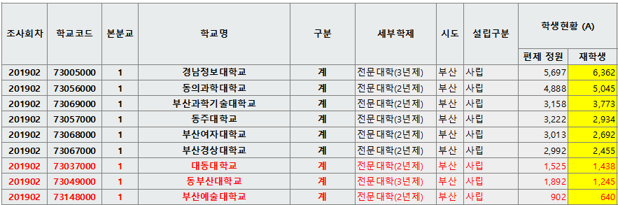 부산에 동부산대가 폐교되며, 재학생은 다른 학교로 편입되고, 교원은 실직하는 문제가 발생되었습니다. 재정문제(비리)로 인한 원인이 가장 큰 이유였지만, 학생수의 감소로 재정이 어려워지는 건 다른 학교들도 마찬가지입니다. 인구감소가 지속되는 부산의 다른 학교들은 어떤 상황에 있는지 확인하도록 하겠습니다.