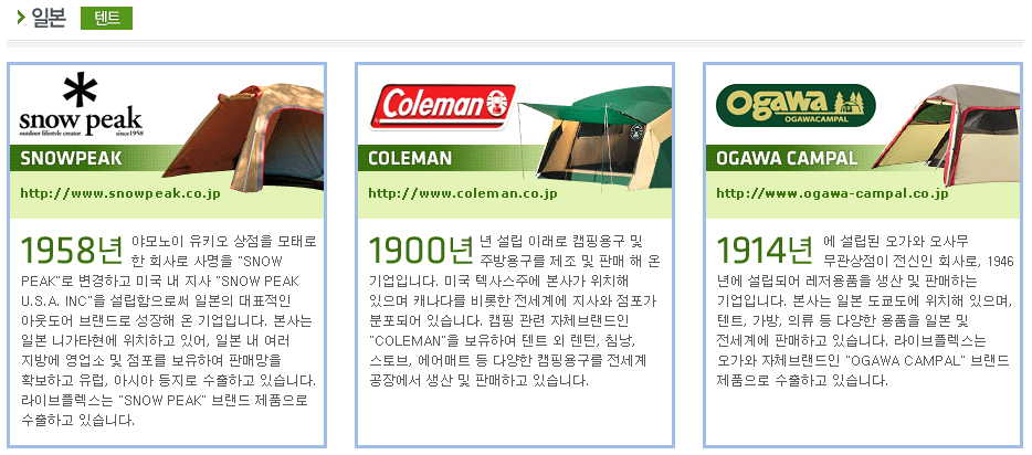 당사는 100%소유지분의 자회사인 중국 텐트 제조공장에서 레저 및 기능성 텐트를 생산하여 일본, 북미, 유럽 등의 세계 빅바이어에게 수출하는 텐트사업을 현재 진행하고 있습니다.