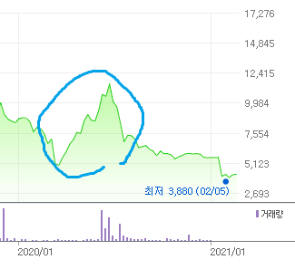 두 번째 올해 1월경 꺾이는 부분은 주식병합으로 인한 액면병합 이후 곡선입니다. 참고 기다린 주주들이 실망하는 부분 이겠네요..
