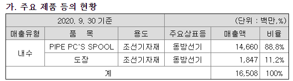 주요 제품의 판매 현황은 아래와 같이 내수 공급이 100% 임을 확인할 수 있습니다.