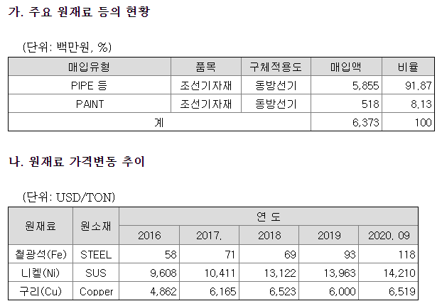 원재료 가격이 비싸지며 가격 및 수급일정에 차질이 발생되어 납품에 문제가 생길 여지가 있습니다.