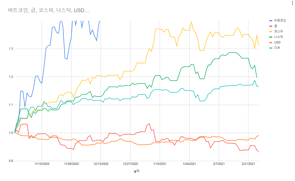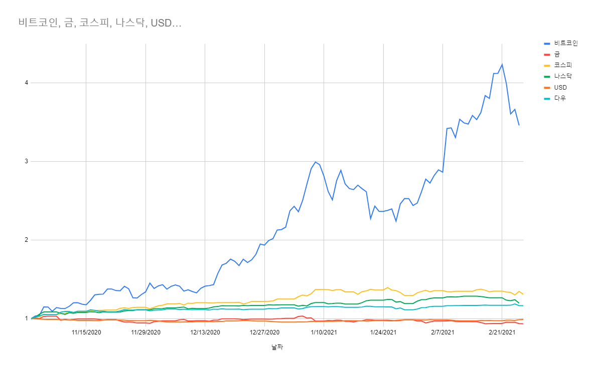 비트코인이 월등히 수익이 좋아. 비트코인을 제외한 나머지 지수들의 투자수익을 비교하니 그다음 순위는 코스피 > 나스닥 > 다우 > 달러 > 금 순위입니다.