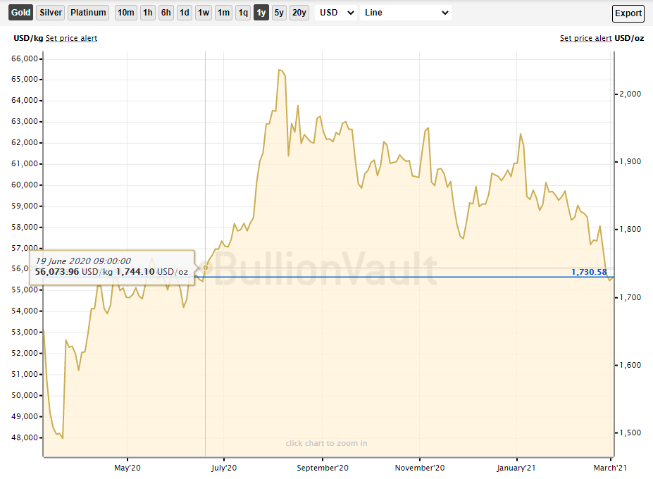 3/2 현재의 금 시세는 2020년 6월 19일 시세와 동일한 상태입니다.