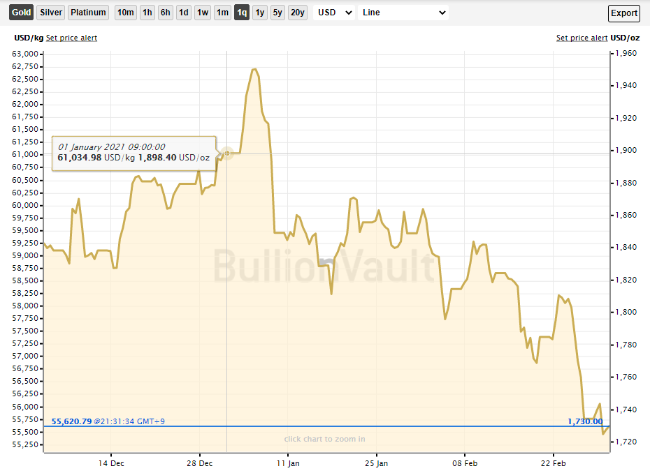 2021년 1월 초 금의 수익률이 달러보다 좋았으나. 2월 초부터 역전되어 가장 투자 수익률이 낮은 상황입니다.