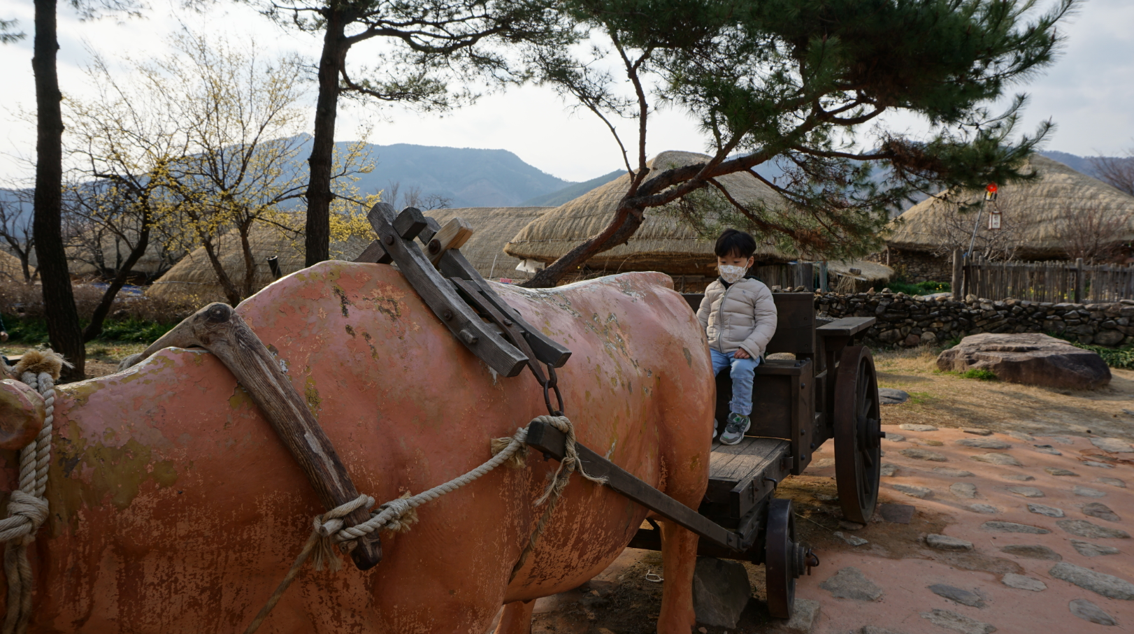 아이는 소 모형에 연결된 마차도 탑승해봅니다. (당황해 하네요..)
