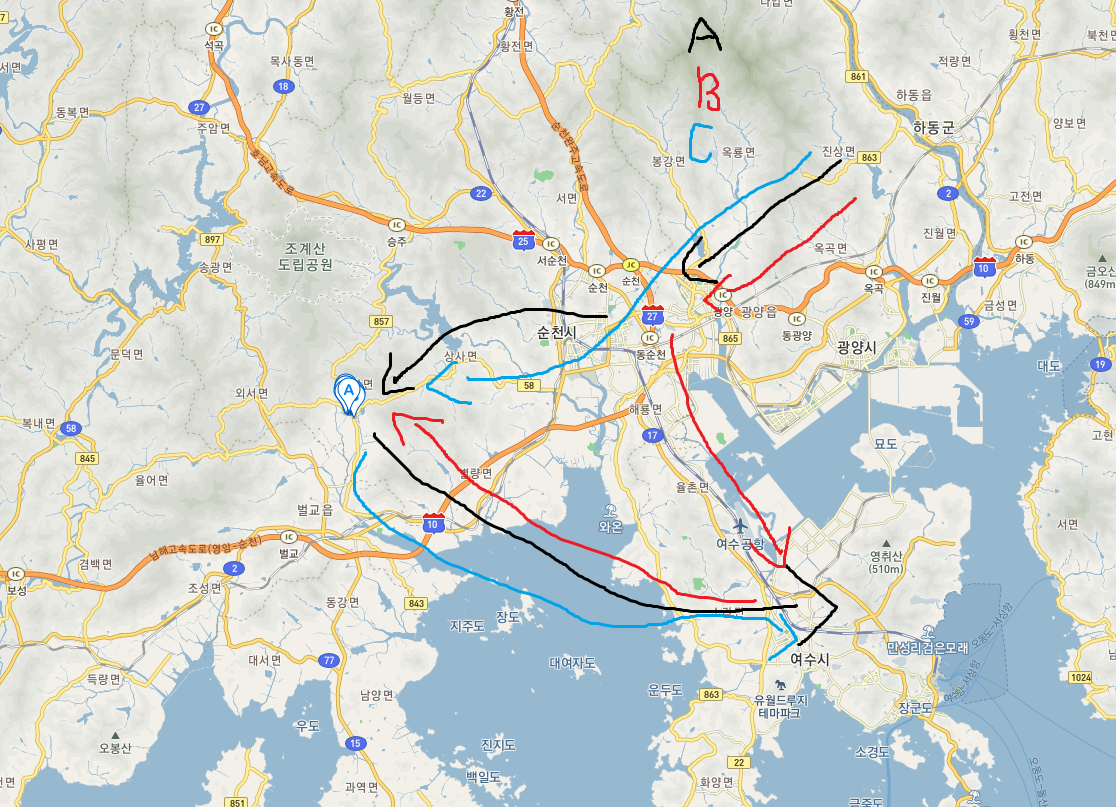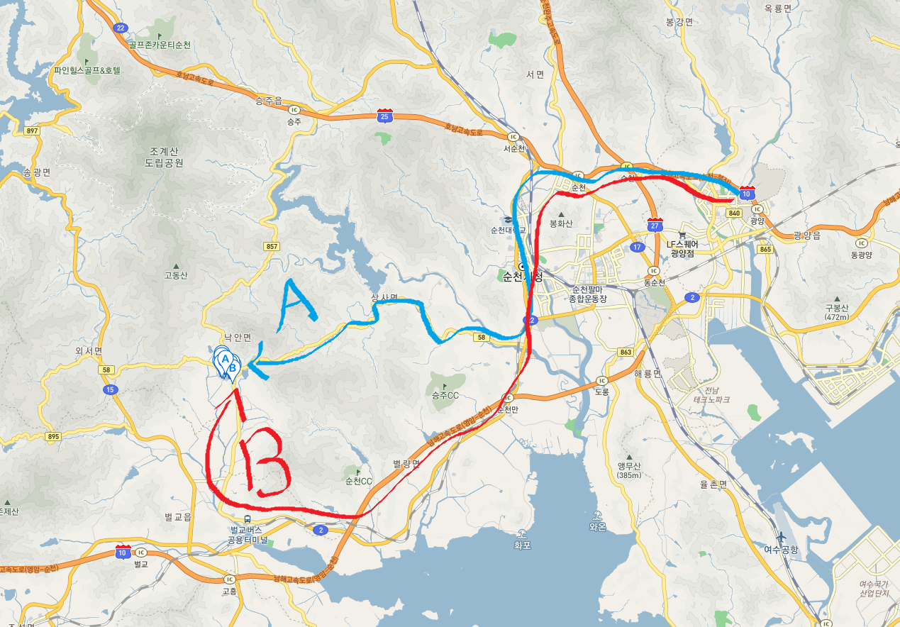코스 B : 순천(드라마 촬영장)->여수(숙박)->낙안읍성