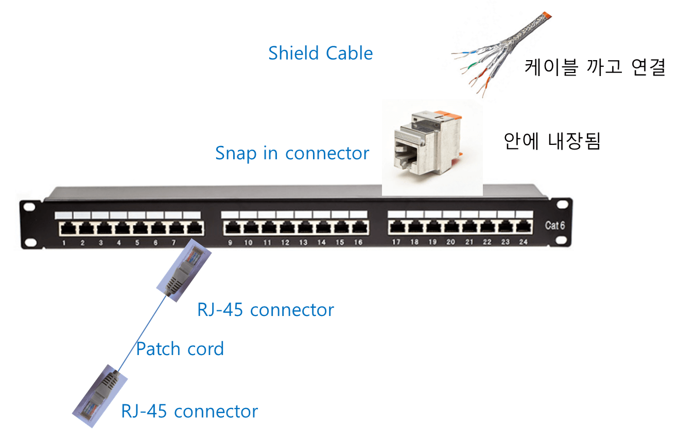 다시 말하면, 랜케이블의 RJ-45 커넥터는 용도가 근처의 장비 연결 용임으로 작고 간단하며, 실드 케이블의 커넥터는 원거리 장치 연결용 혹은 CAT6 패치 패널(나중에 설명하겠습니다)에 연결되는 위의 Snap in connector연결용으로 사용됩니다.